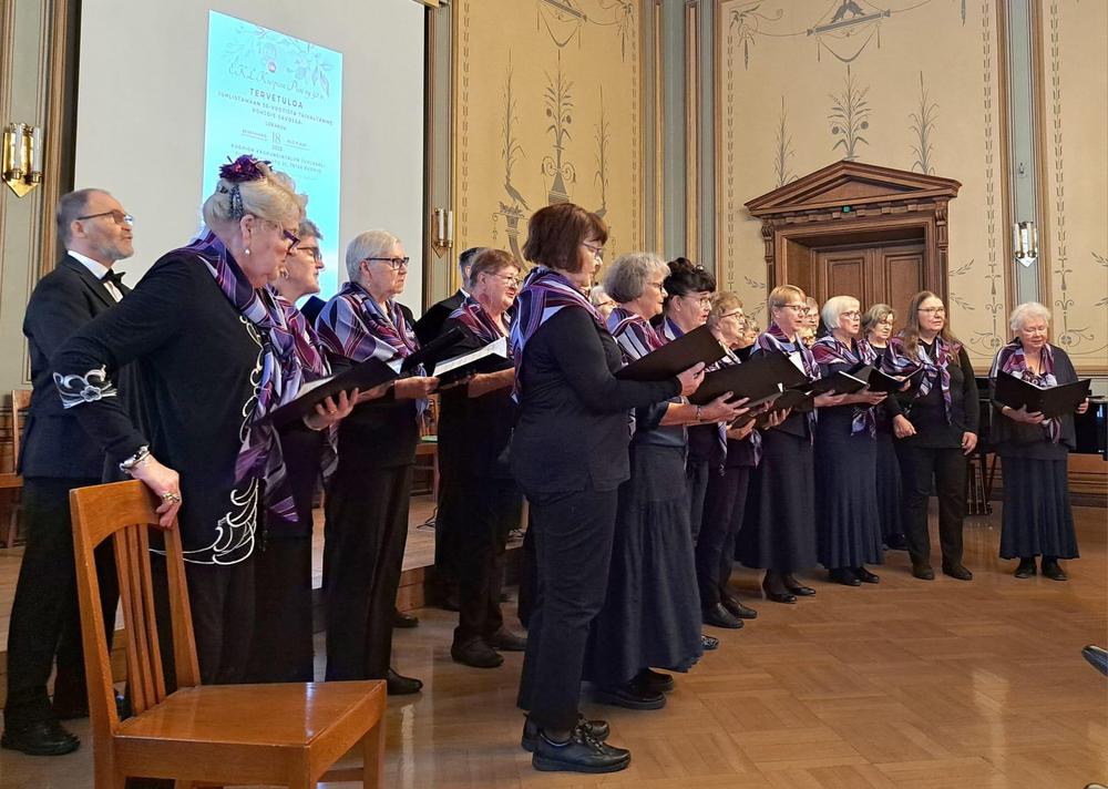Kahvituksen jälkeen seurasi juhlien virallinen ohjelmallinen osuus, puheineen ja esityksineen, jonka ansiokkaasti juonsi Marja-Leena Miettinen. Piirin puheenjohtajan avaussanojen jälkeen Kuopion apulaiskaupunginjohtaja Pekka Vähäkangas toi juhlaväelle kaupungin terveiset. Sen jälkeen saimme nauttia kolmen Kuopiolaisen yhdistyksen, Kuopion Varhaiseläkkeensaajien, Kuopion Eläkkeensaajien ja Kuopion seudun Hengitysyhdistyksen, yhteiskuoron esityksestä. Kauniissa, juhlallisessa salissa kuoron esitys kuulosti todella upealta ja antoi tilaisuudelle omalta osaltaan sille kuuluvaa juhlan tuntua. Kuoron jälkeen lavan otti haltuunsa Iisalmen Eläkkeensaajien Pertti Heiskanen, jonka monologi Eino Säisän runoista oli todella koskettava. Eläkkeensaajien keskusliiton tervehdyksen piirille toi EKL:n valtuuston puheenjohtaja Mirja Janerus omassa puheessaan. Savolaista kielenkiäntöä juhlaväki pääsi nauttimaan Tolokun tyttöjen esityksen aikana. Tyttöjen hulvaton esitys kirvotti kutkuttavasti juhlaväen nauruhermoja useiden naurunpärskähdysten tahdittaessa tyttöjen esitystä.