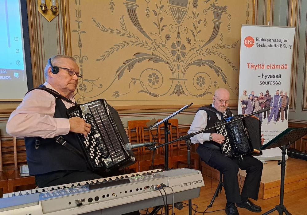 Tilaisuus alkoi juhlavieraiden vastaanotolla, maistuvilla täytekakku kahveilla ja mukaansa tempaavalla Duo Eripoikien esittämällä haitarimusiikilla. Soitto tempaisi todella juhlaväen mukaansa ja yleisö lähti esityksen lopussa mukaan tahdikkain kättentapautuksin, ja taisipa jollain jo tanssijalkakin vipattaa.