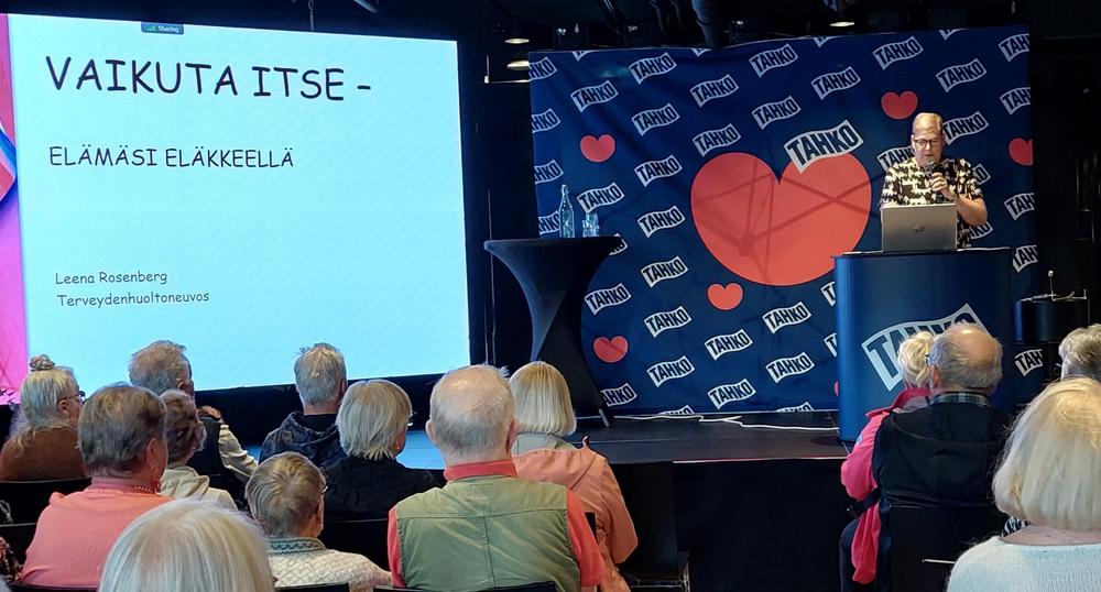 Päivän ohjelma tarjosi sekä ajatuksia herättäviä että hauskoja hetkiä. Leena Rosenbergin luento ”Vaikuta itse – elämäsi eläkkeellä” innosti kuulijoita pohtimaan, miten jokainen voi rakentaa omannäköiset eläkevuotensa. Luennon viesti muistutti meitä siitä, että parhaat hetket toteuttaa omat haaveensa ovat juuri tässä ja nyt.